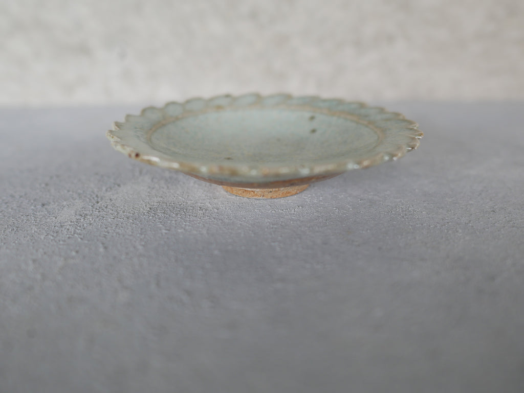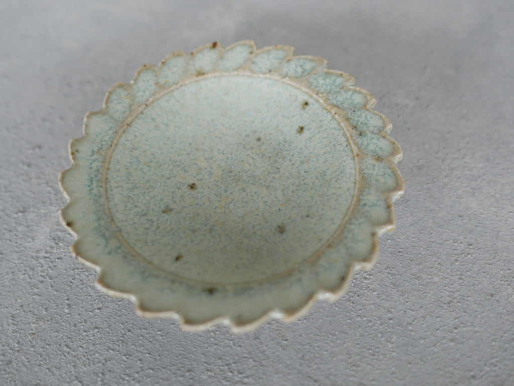 岡本修一さんの輪花豆皿。佐賀県産のお米(さがびより)の餅米の稲藁を灰にして焼成しているそうです。うっすらとした青と白濁した釉薬の落ち着いた雰囲気と輪花の現代的なモチーフとの融合。豆皿ですので、醤油やお塩、薬味などを盛り付けるのにちょうど良い大きさ。また落雁などの一口菓子にも。
