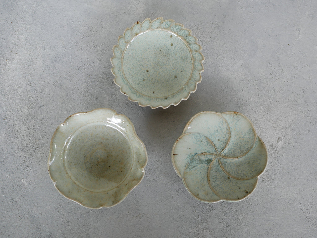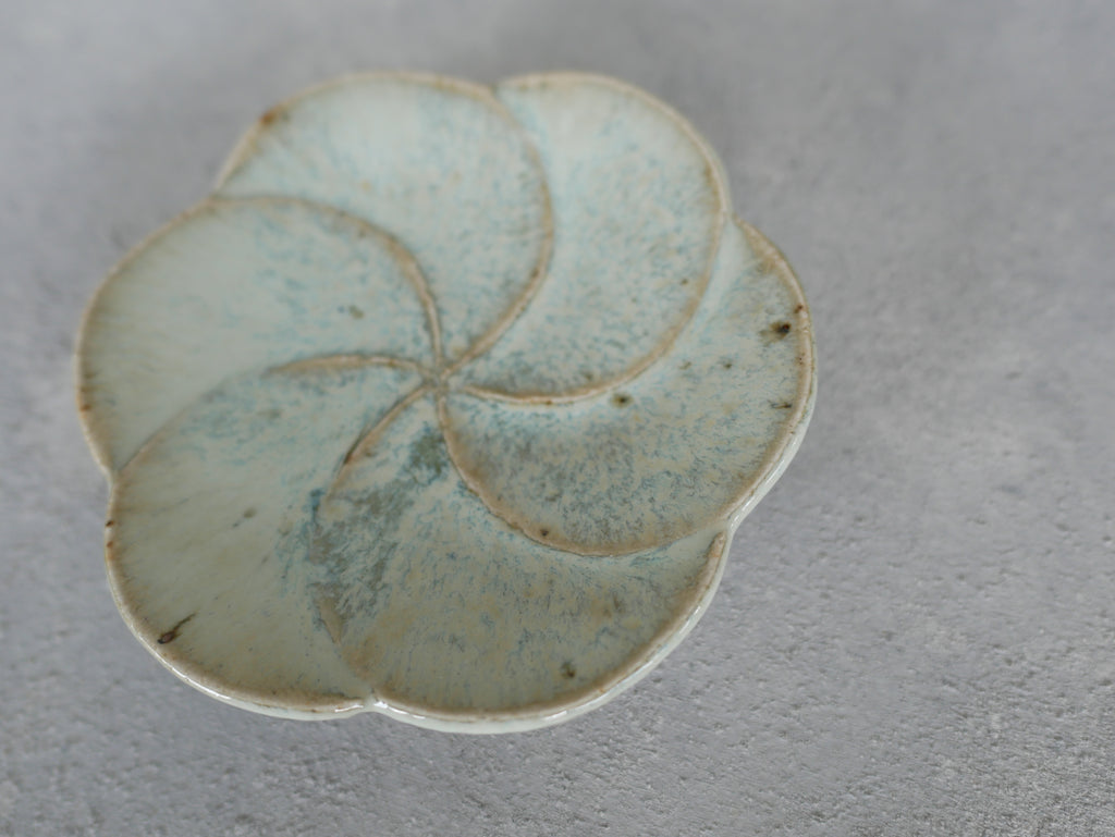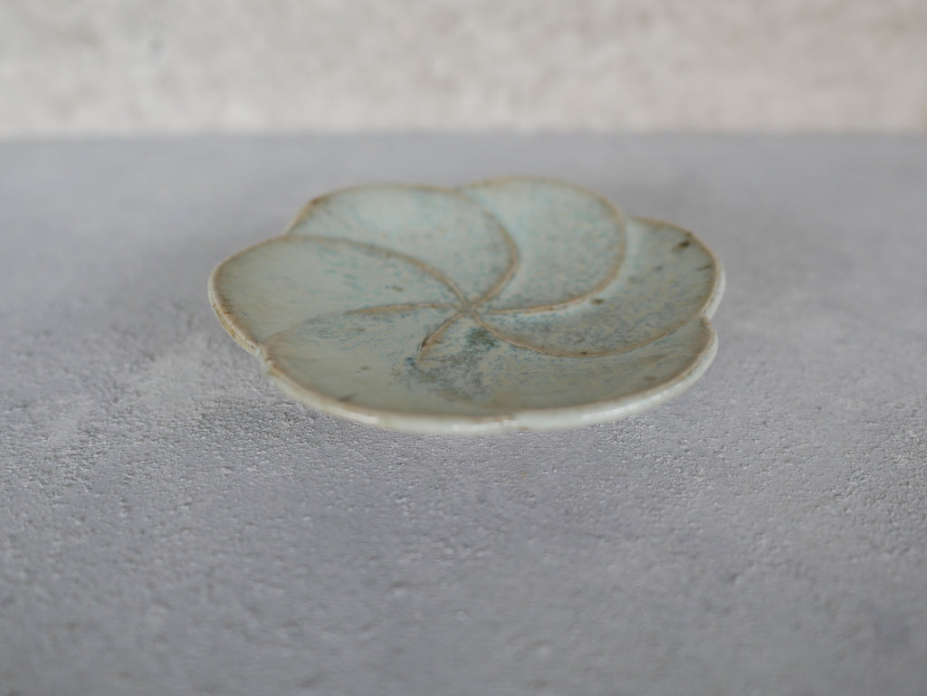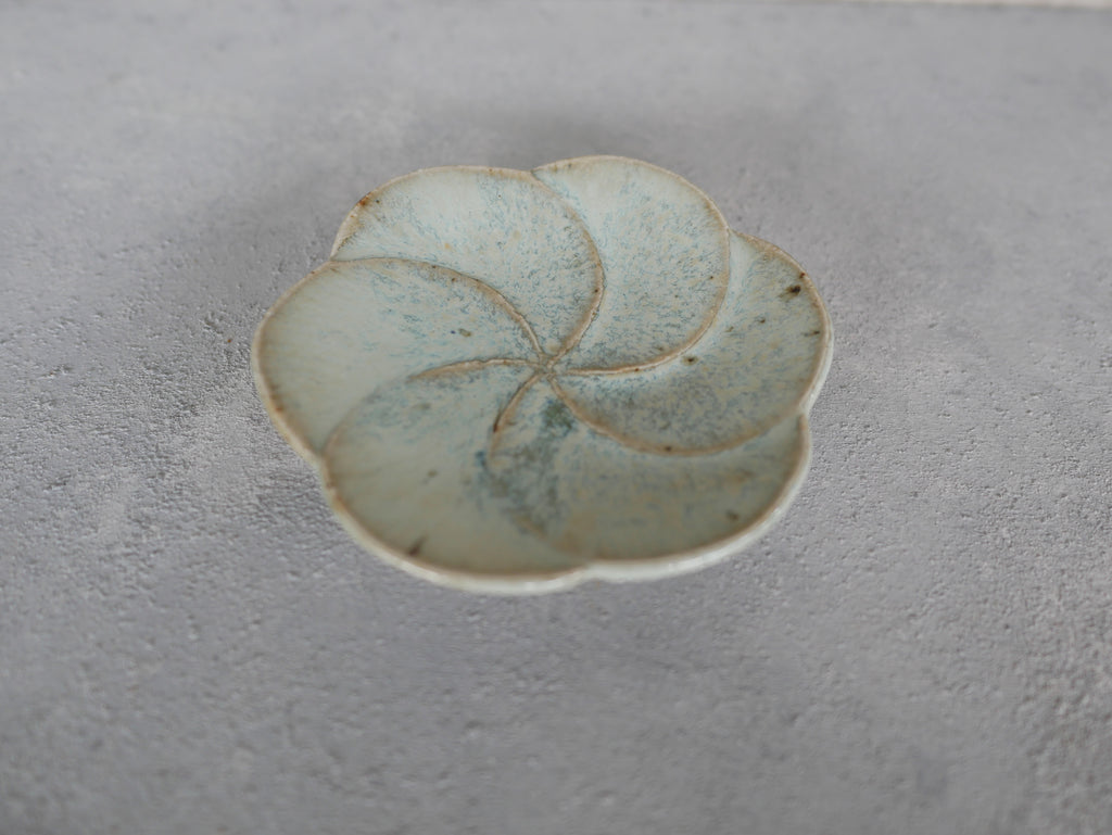 岡本修一さんの輪花豆皿。佐賀県産のお米(さがびより)の餅米の稲藁を灰にして焼成しているそうです。うっすらとした青と白濁した釉薬の落ち着いた雰囲気ですが、花びらのモチーフが可愛らしい趣を添えています。豆皿ですので、醤油やお塩、薬味などを盛り付けるのにちょうど良い大きさ。また落雁などの一口菓子にも。