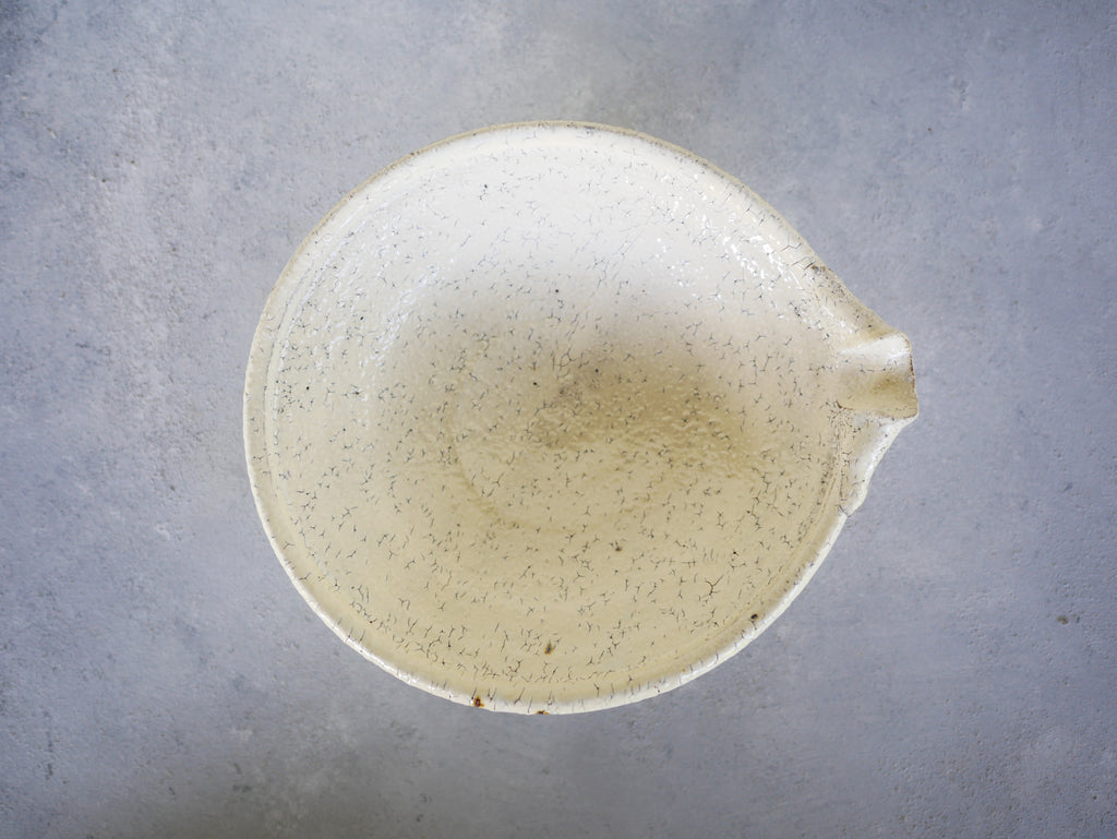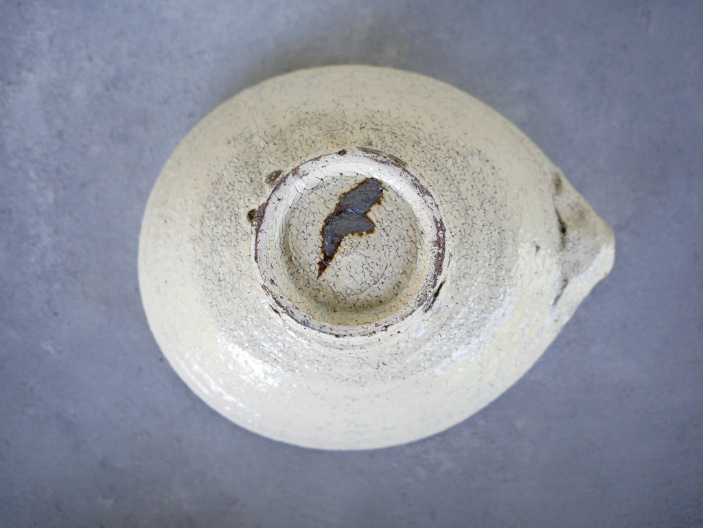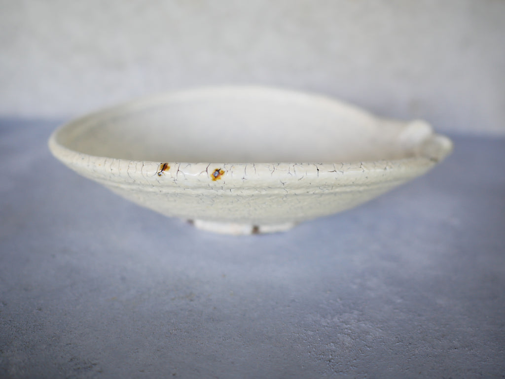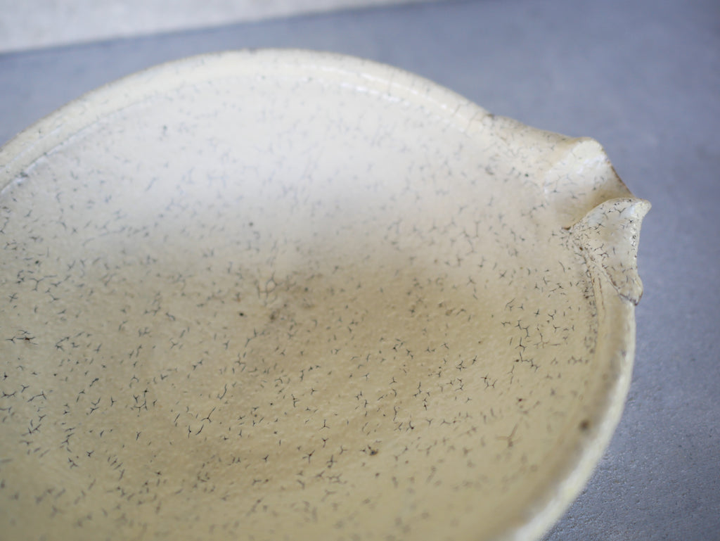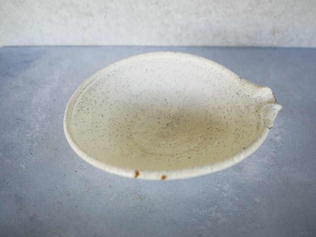 野菜の和物、肉じゃが、サブジなど、毎日の食卓に使いやすい工藤和彦さんの定番、平片口皿。少し深さがあるので、盛り付けがしやすいのも嬉しいですね。従来の粉引よりも温かみのある、生成りのような白で、料理を包み込むような優しさが感じられます。