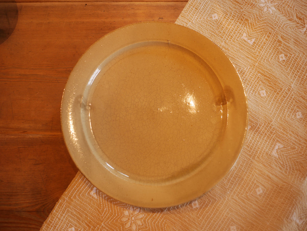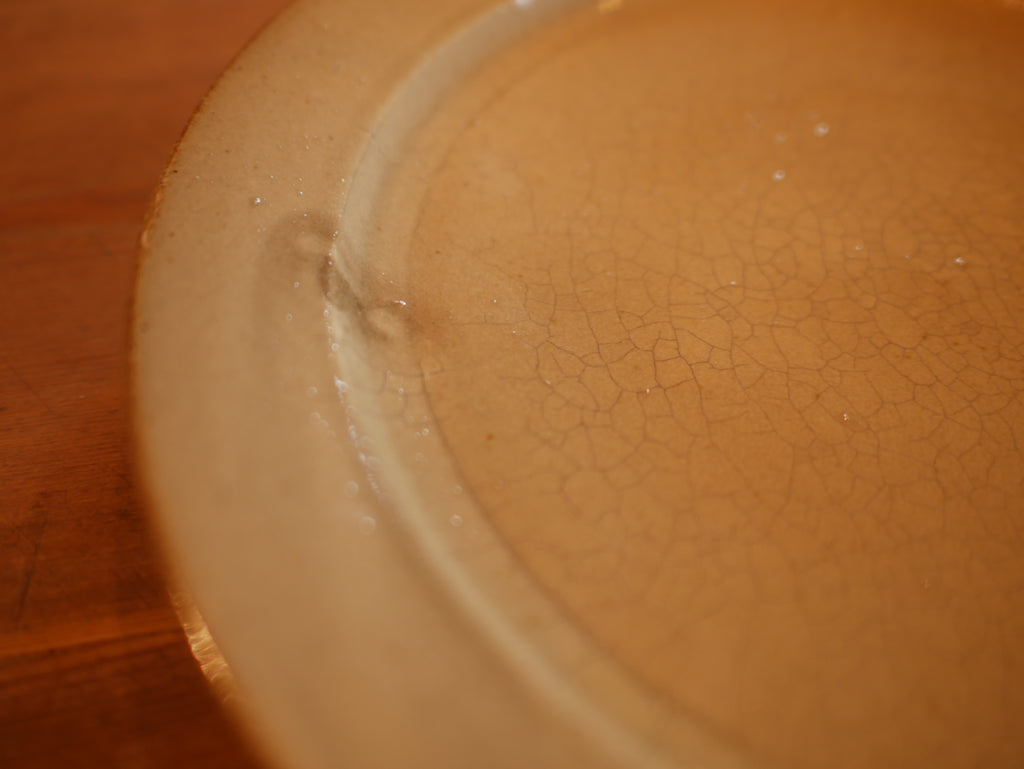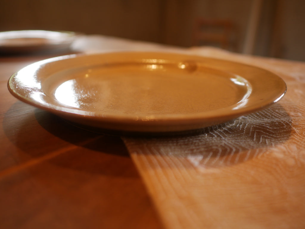 中里花子さんのリムディナープレート。唐津の工房にお邪魔した際に、シャハニが一目惚れした一品です。薄く細かな貫入がお皿を這う蔦のように広がっており、一皿ひと皿の印象が微妙に違います。カラシとベージュ、どちらもアンニュイな色合いがお料理を引き立ててくれます。豚の生姜焼き、とんかつ、チキンのトマトソース、おうちでちょっぴりご馳走の日にいかがでしょうか。